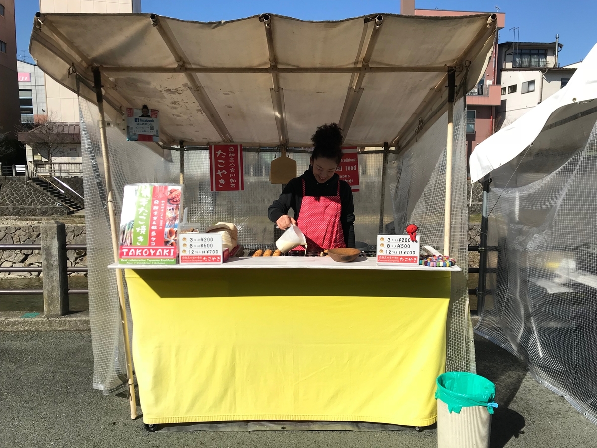早朝、寒空の下、アツアツのたこ焼きを宮川を目の前に食べる。