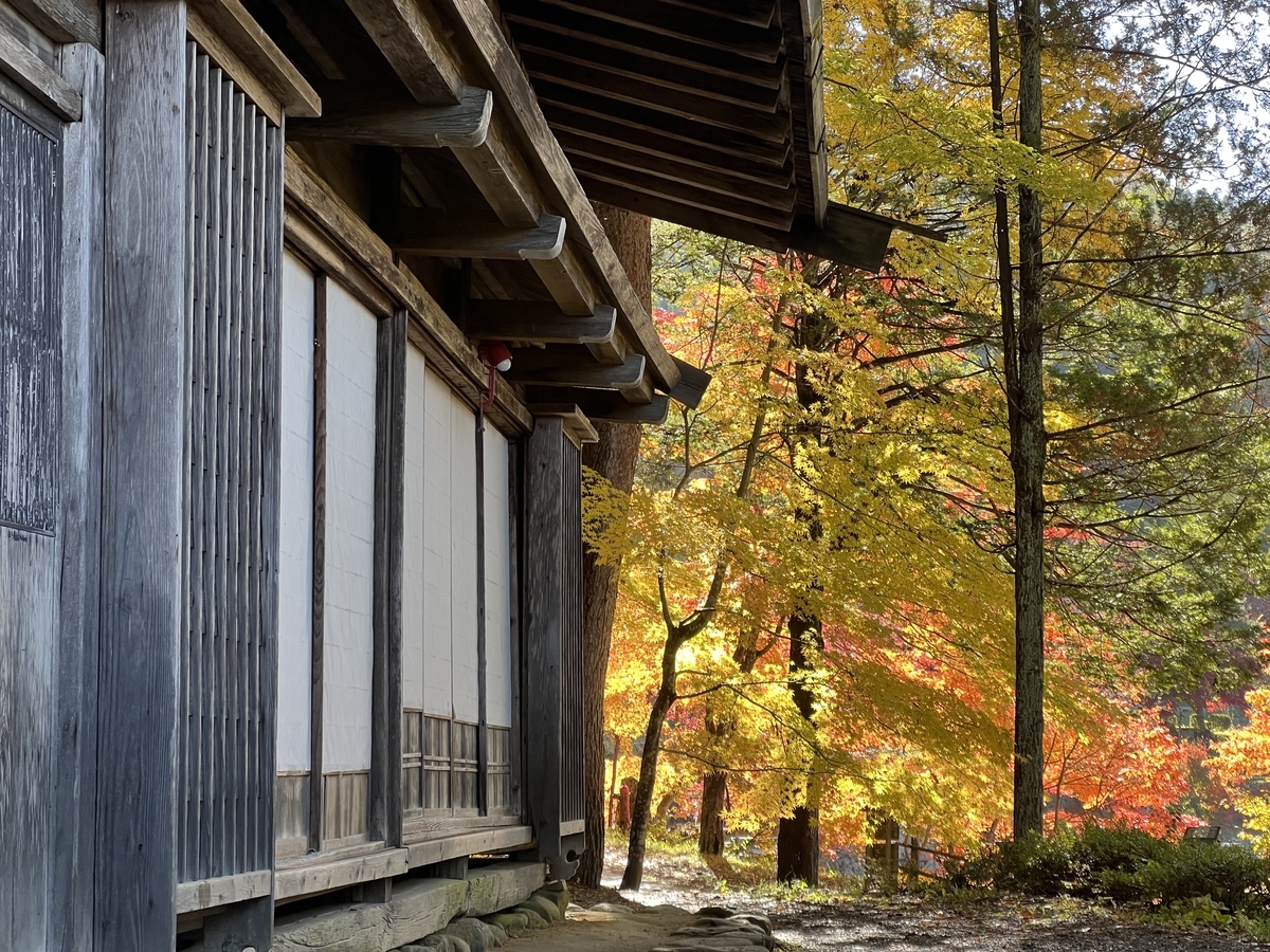コンクリートで固められた建物は比較的新しいけども、こうした木造の昔の建物と紅葉は江戸時代からも変わらない光景なんだろうなと思います。