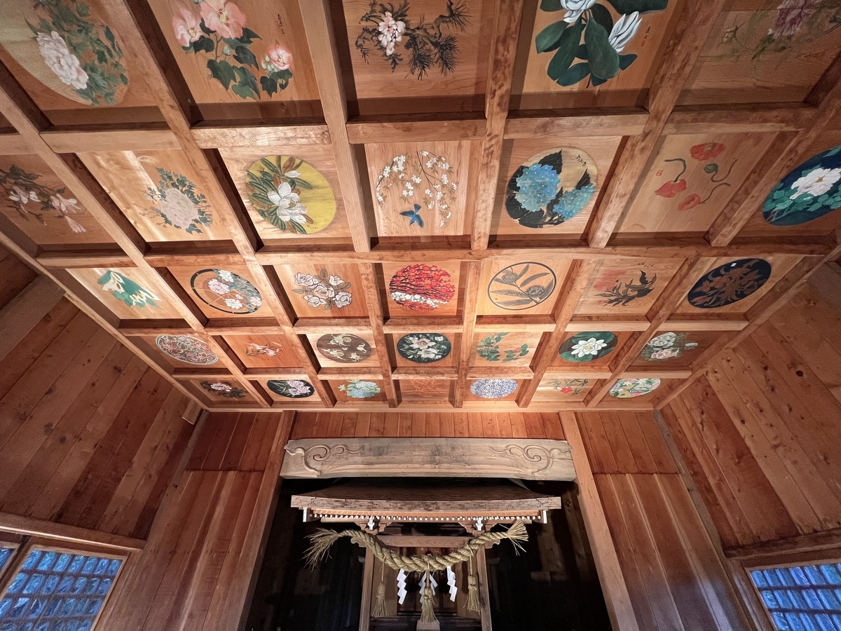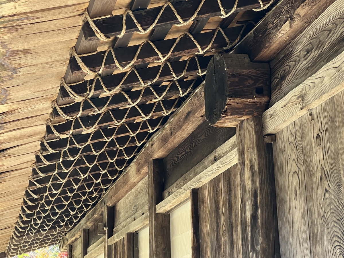 中から天井を見ると天井がなく、榑葺き屋根と垂木母屋がそのまま見れます。