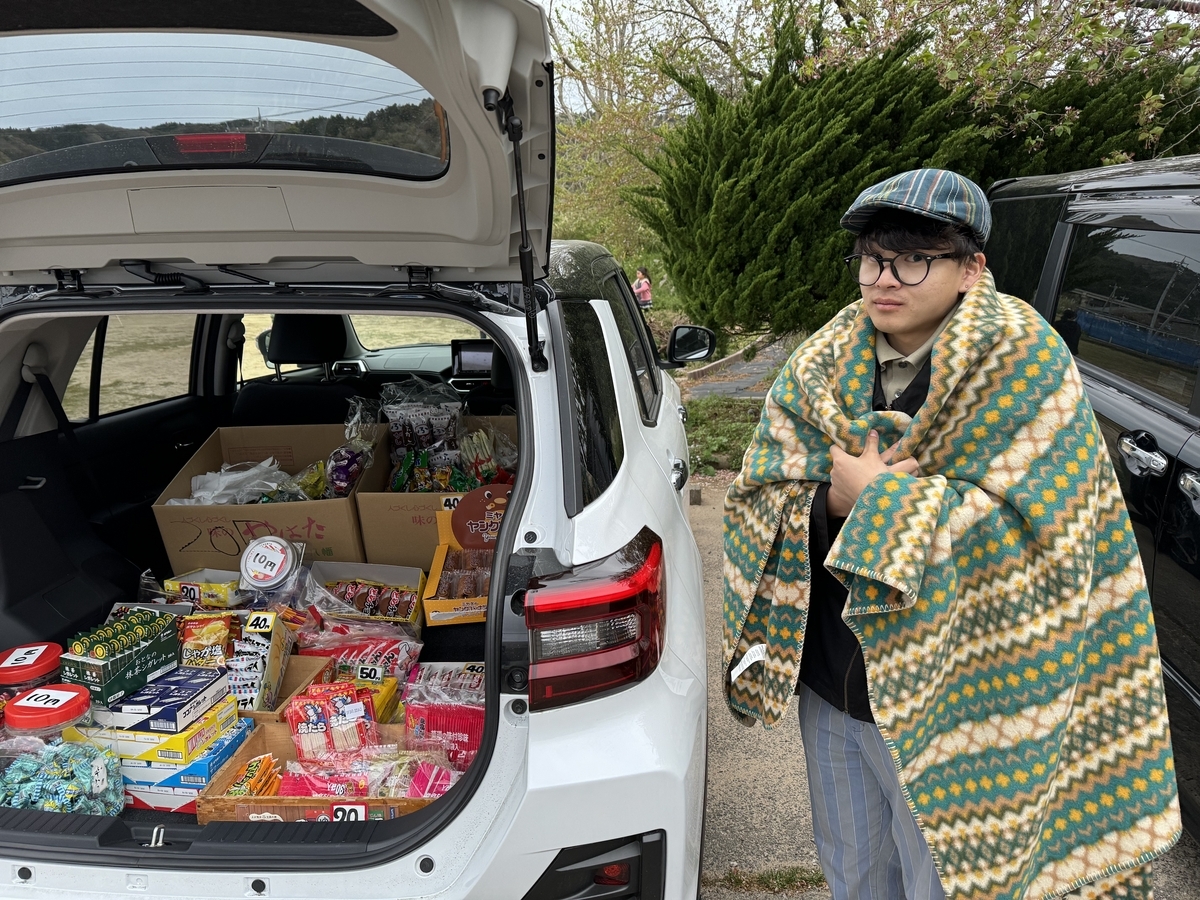 風が吹き、北陸の寒さに慣れていないこいちには車中泊で活躍したパタゴニアのブランケットを身に纏います。
