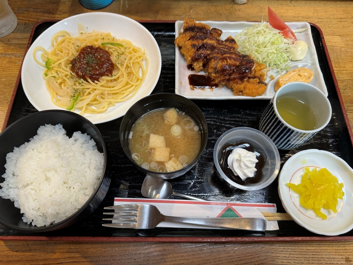 とりあえず前菜のパスタを全部食べてから、チキンカツ定食にします。笑