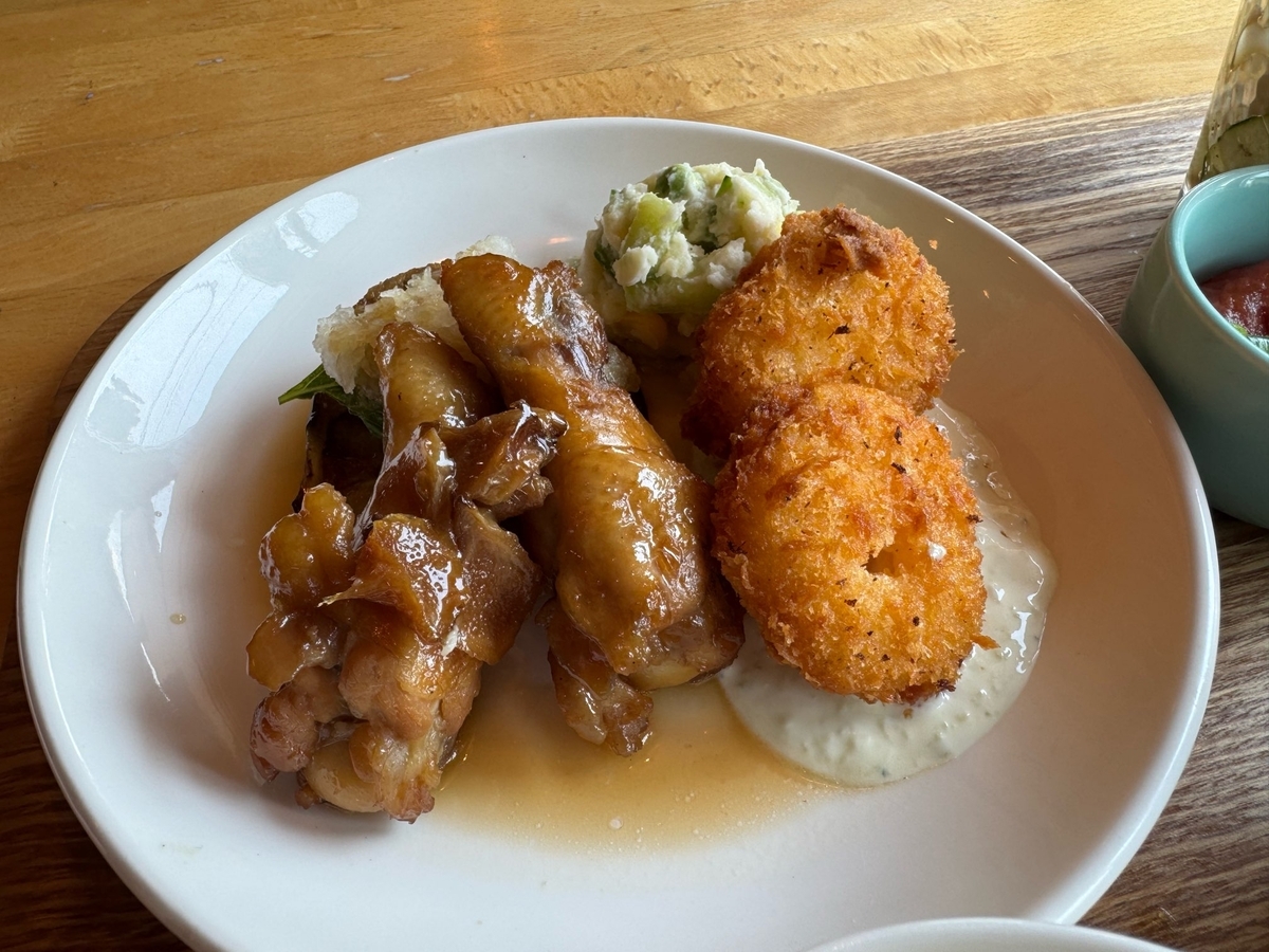大皿にはおろしバーグ、手羽元甘煮、エビカツとオールスターです。